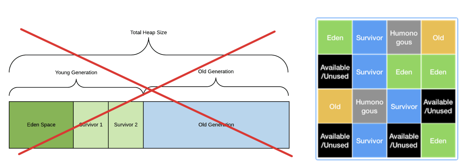 - 기존 Heap 영역을 물리적으로 고정된 Young / Old Generation으로 사용하는 방식이 아닌, Region이라는 개념을 도입하여 Heap 영역을 체스판 모양으로 균등하게 여러개의 지역으로 분할하여 Eden, Survivor, Old 영역을 고정이 아닌 동적으로 부여함