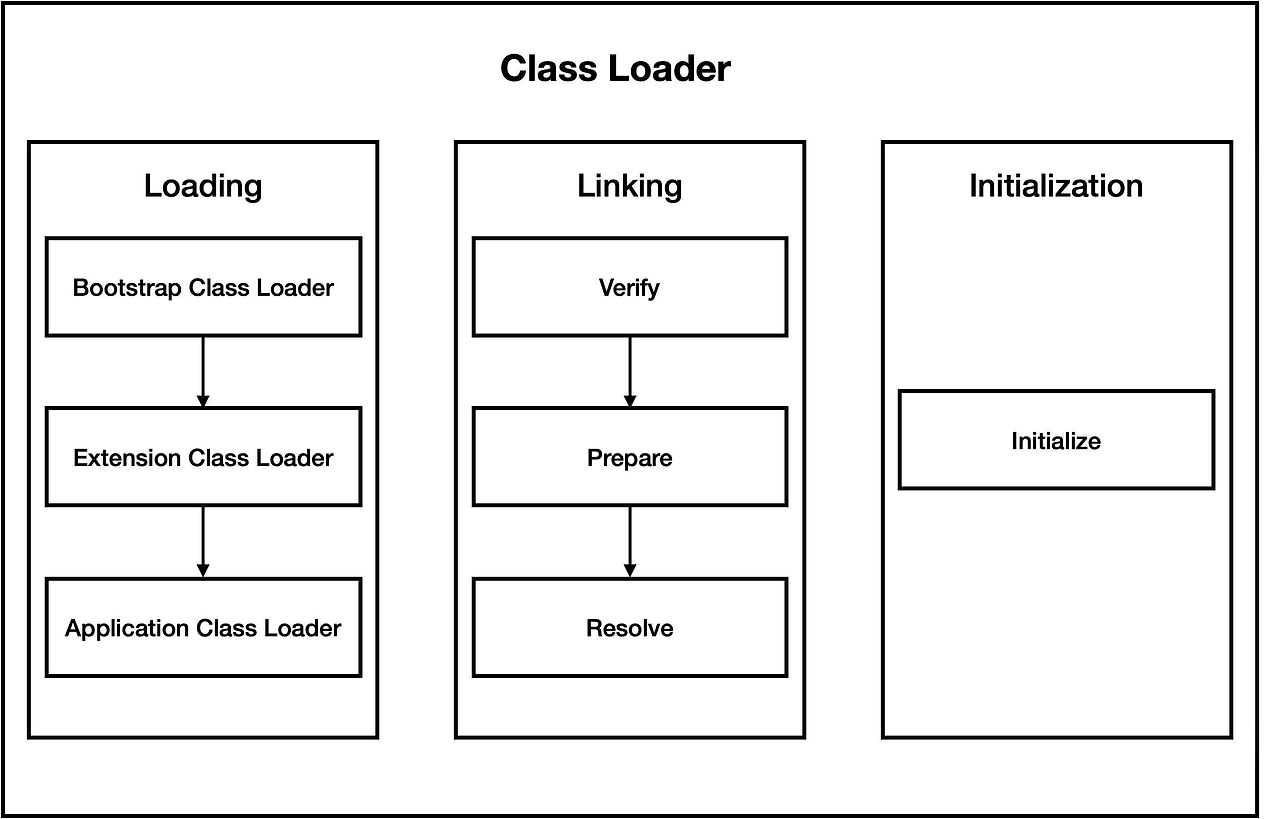 클래스파일 로딩 순서는 위 이미지의 왼쪽 순서부터 Loading → Linking → Initalization의 단계로 구성됩니다.