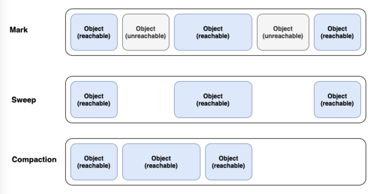 - Compact : Sweep 이후 파편화된 메모리 공간을 모아주는 작업을 진행합니다. 이로 메모리효율을 높일 수 있지만 Compact 작업과 레퍼런스를 업데이트 하는 작업이 필요해 오버헤드가 발생할 수 있습니다.(GC 종류에 따라 하지 않는 경우도 있음)