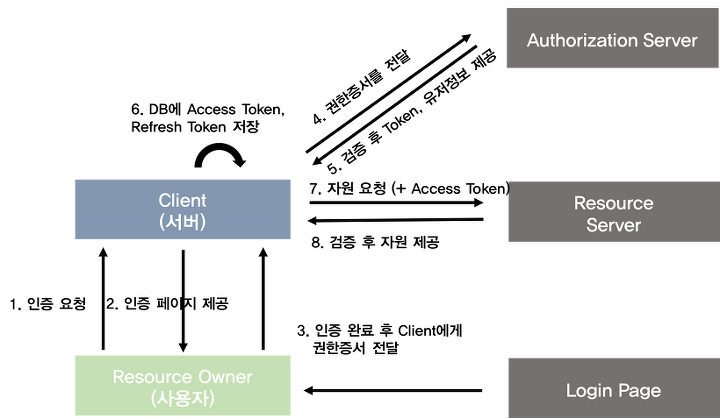 1. Resource Owner(사용자)가 Client(우리 서버)에게 인증 요청(로그인)을 합니다.