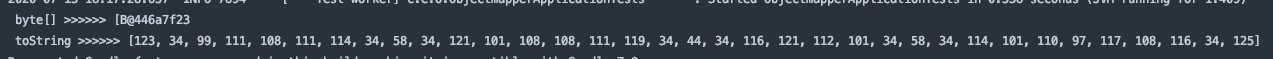 @Test void test3() throws IOException { ObjectMapper objectMapper = new ObjectMapper(); Car car = new Car("yellow", "renault"); byte[] result = objectMapper.writeValueAsBytes(car); System.out.println(" byte[] >>>>>> "+result); System.out.println(" toString >>>>>> "+ Arrays.toString(result)); }